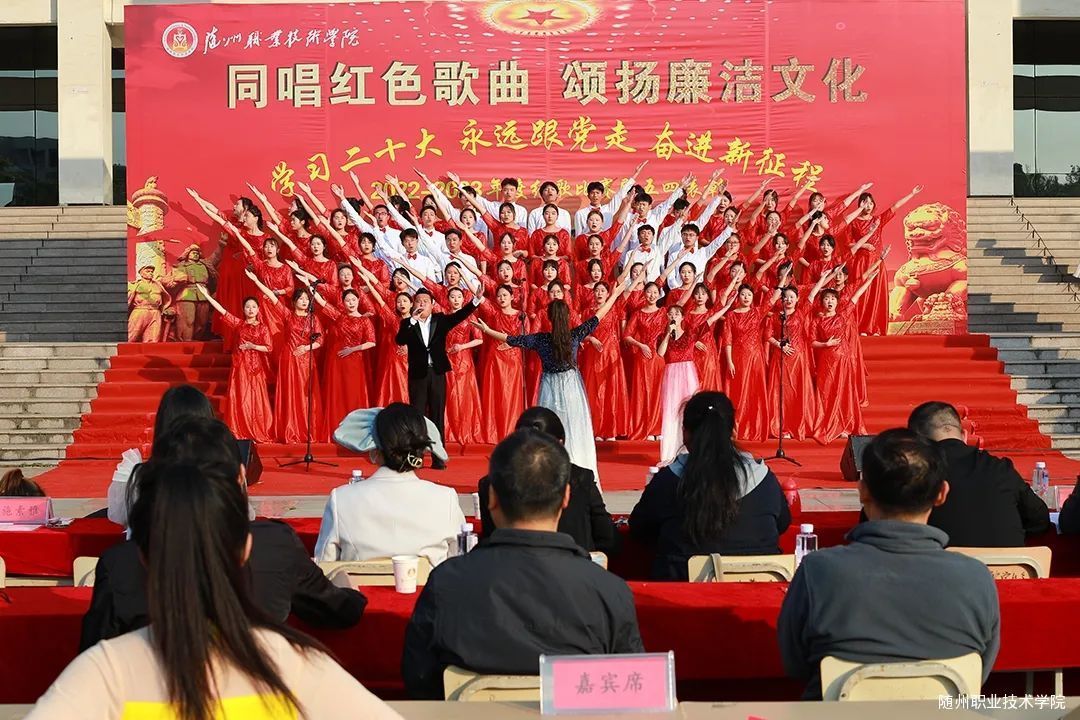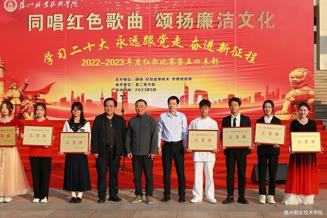 5月11日,嘹亮的歌声响彻在校园的各个角落,随州职业技术学院“同唱红色歌曲 颂扬廉洁文化 ——学习二十大 永远跟党走 奋进新征程”2022-2023年度红歌比赛暨五四表彰活动在图书馆前编钟广场拉开帷幕。校党委书记马大奎,党委副书记、校长李建伟,党委委员、纪委书记、监察专员李高东,党委委员、副校长梁学军、邹厚亏出席本次活动。各二级学院分管学生工作副书记、学工办主任、团总支书记、各二级学院参赛队伍及受表彰代表参加活动。