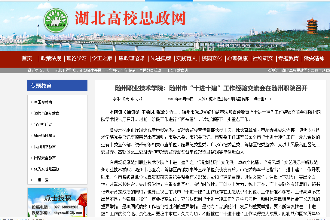 湖北高校思政网:随州职业技术学院——随州市“十进十建”工作经验交流会在随州职院召开